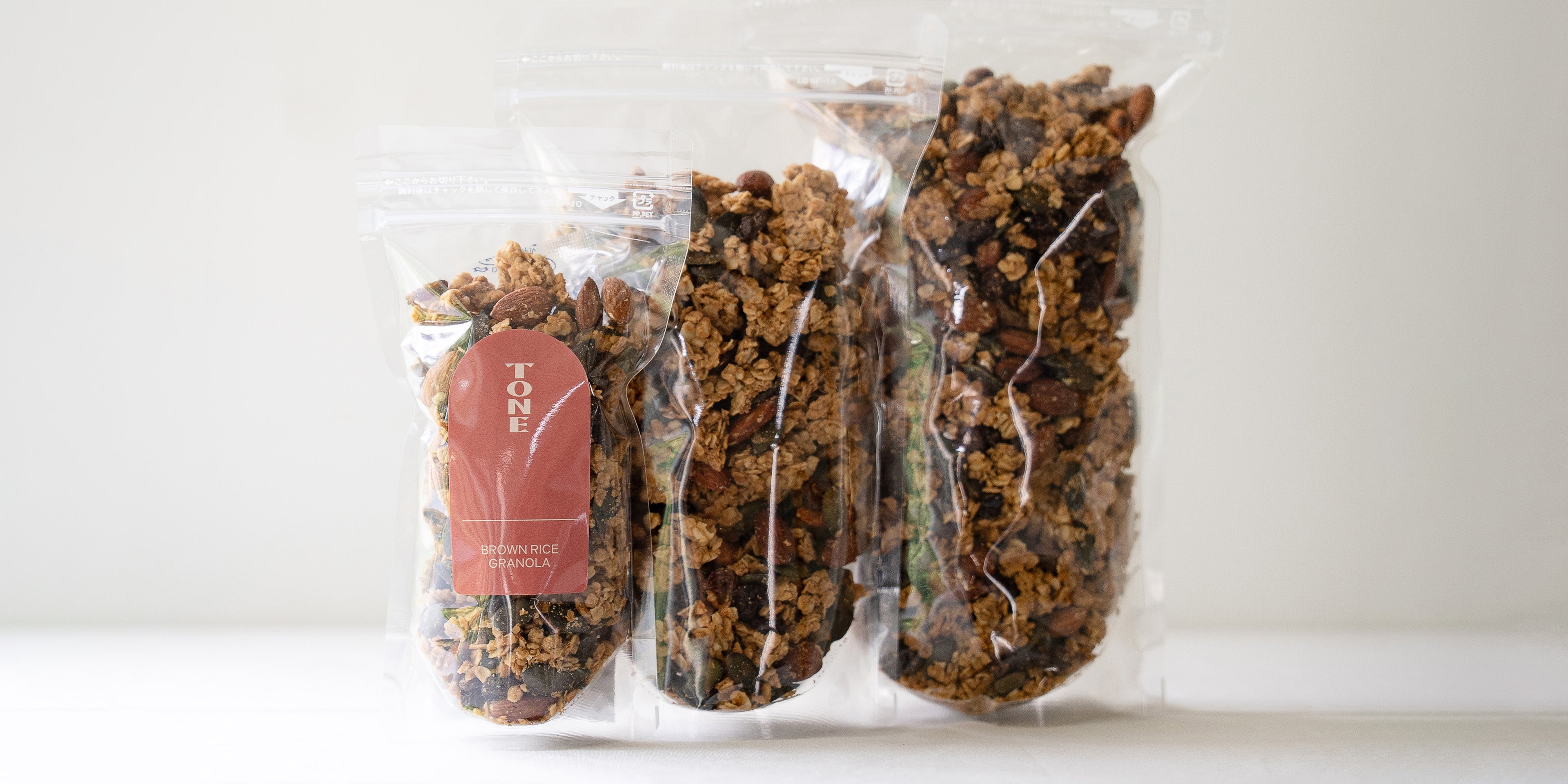 定番のグラノーラには、ミネラルや食物繊維が豊富な玄米粉を使用し、体に優しい食材のみで仕上げています。soy milk を扱う「Peace」 さんの "おから"を使用したグラノーラもご用意し、2種類の味をお楽しみいただけギフトにもおすすめです。